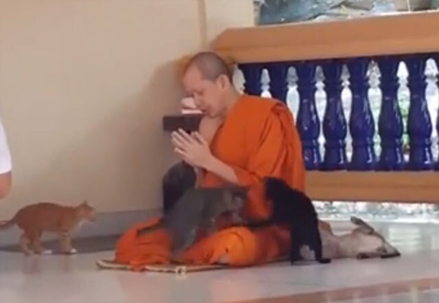 でもってタイに住むこちらの猫は、仏教の道へ進んだようで、僧侶に仏教とは何たるかを説いてもらっているようだ。