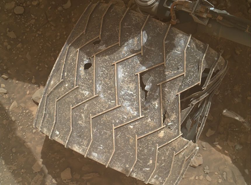 その間、火星の荒々しい地形のせいでアルミ製の車輪に少しずつダメージが蓄積し、大きな穴が開いてしまったようだ。