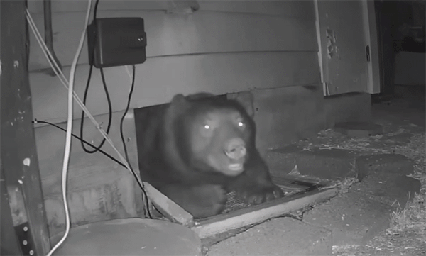 すると、物音の正体が明らかになった。2024年10月3日午前4時40分頃、監視カメラがとらえていたのは、巨大なクマが床下の小さな穴から出ようとする姿だ。
