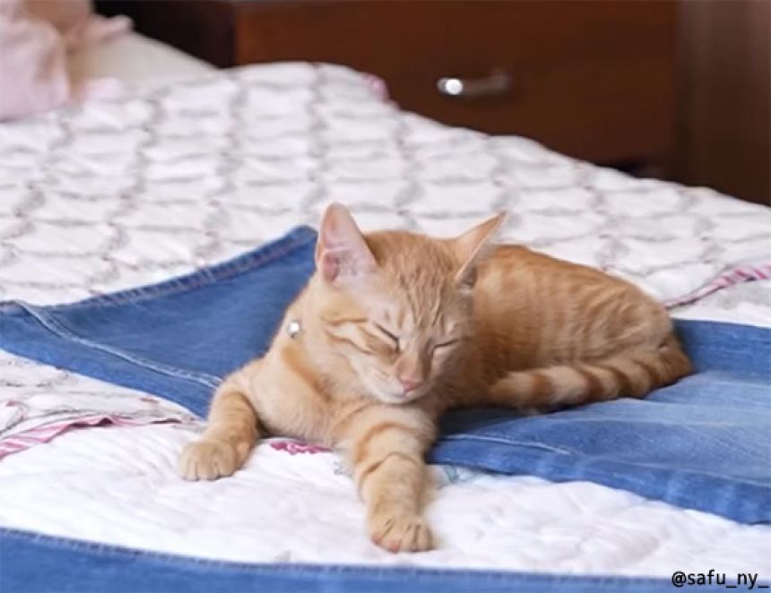 ある日、ベッドの上に用意したジーンズを履いて出かけようとしたところ、その上に猫が気持ちよさそうに寝ていた。