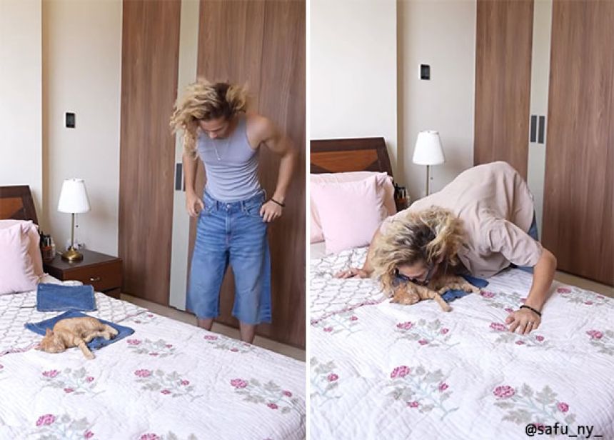 この画像を大きなサイズで見るここで猫飼いの掟が発動する。猫を起こしてジーンズを履くことに強い罪悪感を覚えたサフヴァンさんは、猫を起こさずにジーンズを履く方法を考え実行した。