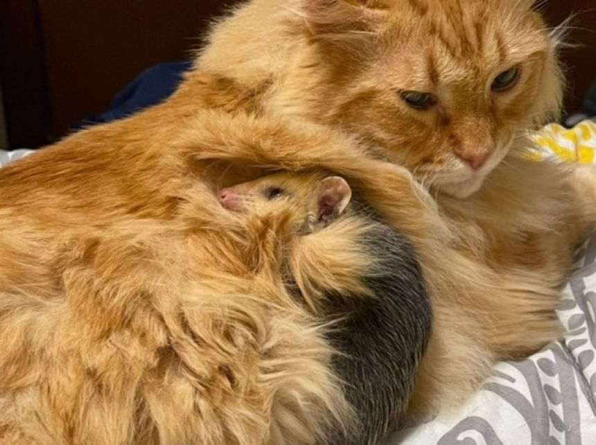 するとトニさんの愛猫のオリバー氏が、母親代わりを買って出た。自分のゴージャスな毛並で赤ちゃんオポッサムを優しく包みこんでくれたのだ。
