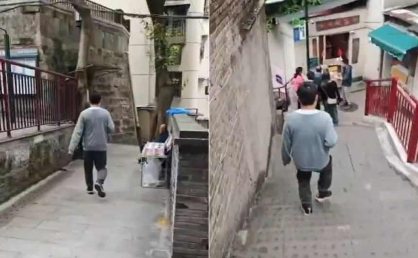 動画は男性が家を出るところからスタートする。家の前の階段を下りると、さらにまた階段、そしてまた階段。