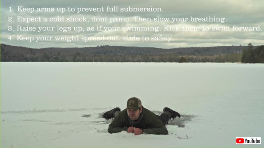 この画像を大きなサイズで見るもし一人で凍った湖や川にいるとき急に氷が割れて落ちてしまったら?いきなり落ちて体ごと氷水に浸かるなど恐怖でしかないが、アウトドアの達人が体を張って伝授する自力での脱出方法が紹介されていた。