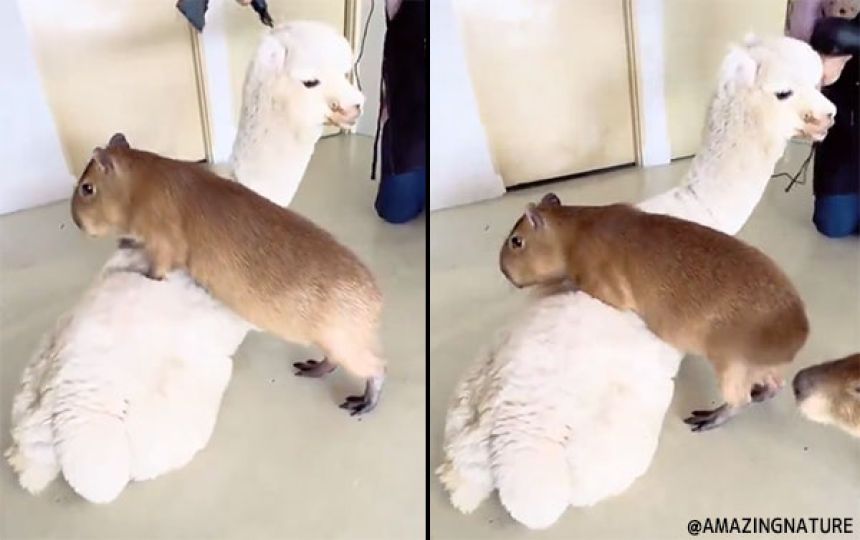 床に座りながら、ドライヤーを当てられているアルパカに近づいてきたカピバラは、いきなりアルパカの背中に乗ってきた。