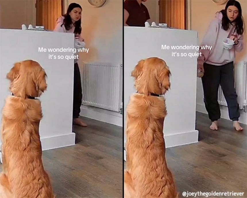 朝の忙しい時間で、飼い主はうっかり合図を出すのを忘れてしまったのだ。その間ずっと待ち続ける犬。気が付いてほしくて背筋を伸ばして台所の方をみるが、キッチンカウンターが高いため飼い主は気が付かない。
