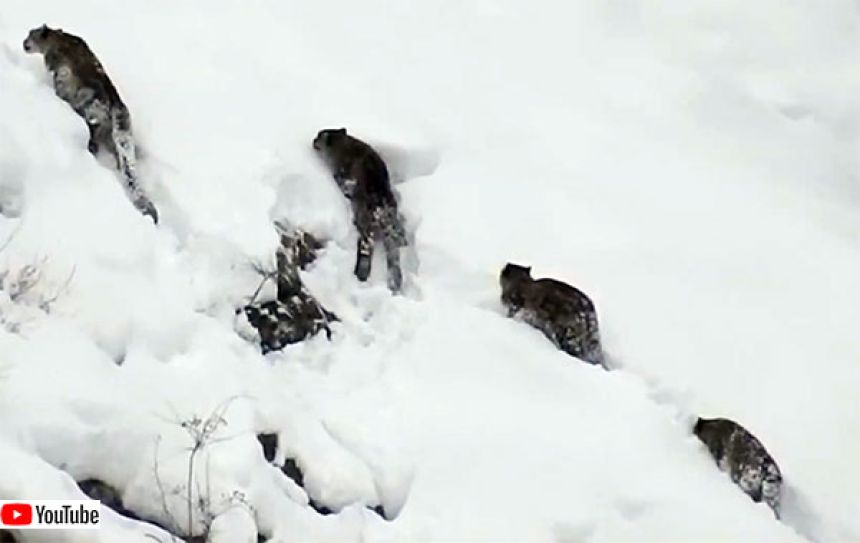 この画像を大きなサイズで見るパキスタン北部の雪に覆われた山で、滅多に見ることができない4頭のユキヒョウが歩いている姿が撮影された。