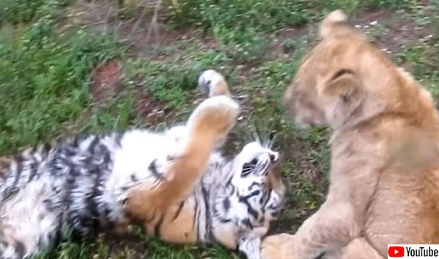 トラもライオンも赤ちゃん時代はイエネコみたいにかわいいよね。ただしお手手の大きさがイエネコのそれとは段違いなので、そこで見わけがつくのかな。小さいころから一緒に育つと、同じネコ科同士仲良くなれるもんなんだね、そして恋落ちて、ハイブリッド種のライガーとかタイゴンが誕生しちゃうのかな。