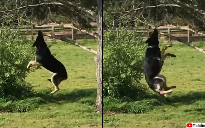 木の棒派の犬は、何が何でもこの棒を手に入れようと奮闘する。 何度もジャンプし、枝を口にくわえて、その力で木から切り離しにかかったのだ。