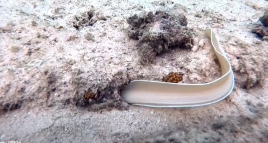 この画像を大きなサイズで見る英語では「ホワイトリボン・イール(白いリボンのウナギ)」と呼ばれており、文字通り白くて細長いリボンのような身体をしている。頭の部分に少しだけ黒い斑点があるのが特徴だそうだ。