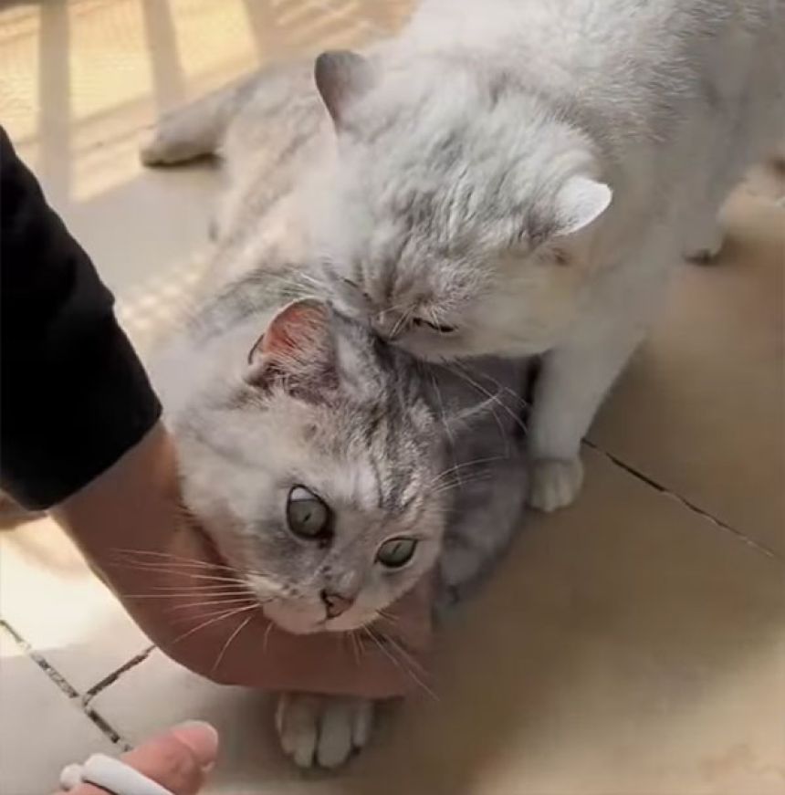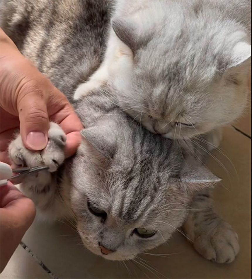 「どうせ切られるんだから、じたばたせずにとっとと済ませてしまった方がいい。動くと危険だから、私がアシストしよう」そんな気持ちがあったのかどうかはわからないが、飼い主が爪切りを持ち、灰色トラ柄の猫を押さえつけた瞬間、もう1匹の白っぽい猫が動いた。