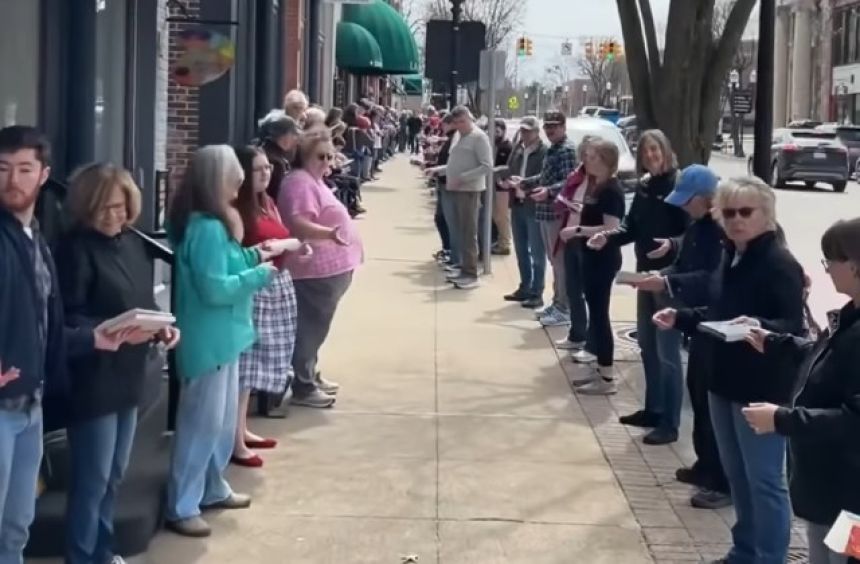 すると支援の申し出が殺到し、なんと300人以上の住人達(それに1匹の犬も)が手伝いに名乗りを上げてくれた。近所の人はもちろん、お客さんや通行人までもが協力し、人間の鎖を作って作業開始。