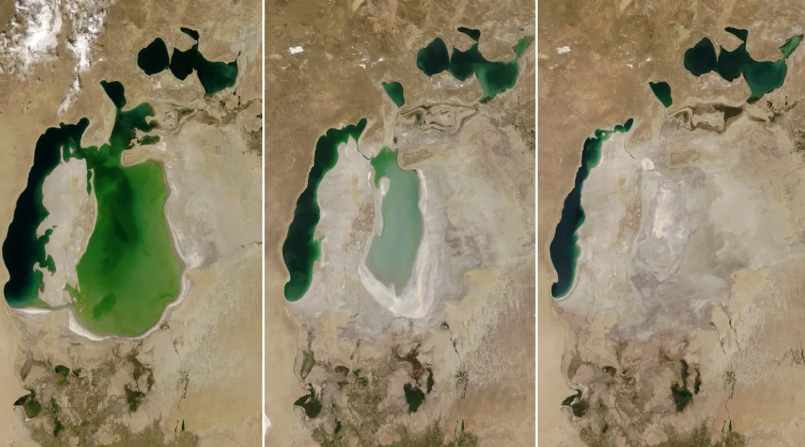 この画像を大きなサイズで見る中央アジアの「アラル海」は、無謀な人為的灌漑事業によってほとんどの湖水が干上がったことで、周辺の生態系や経済に甚大な被害をおよぼす環境破壊が起きたことから「静かなチェルノブイリ」とも呼ばれている
