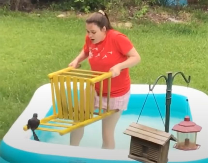 プールに入り椅子を使ってリスの救出を試みる娘さん。リスを驚かせないよう慎重に近づいていく。