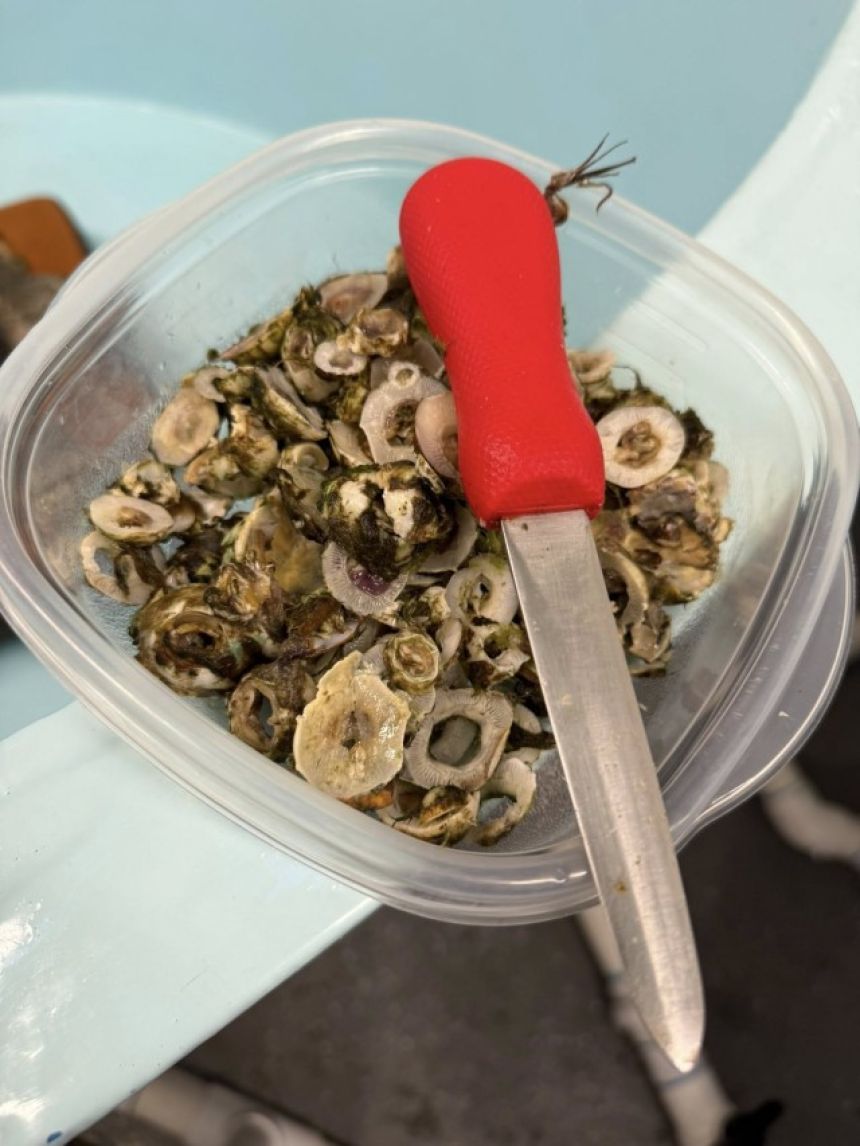 こちらがこのウミガメから除去されたフジツボの一部。カメに付着するフジツボの種類は、カメの種類や生息する環境によっても違いがあるらしい。