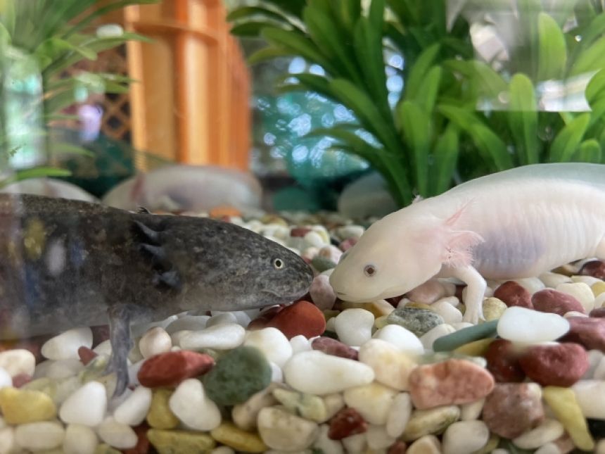 ウーパールーパーは両生類で、サンショウウオの仲間だが、おとなになってもほとんどが幼体の姿のままなのが特徴だ。