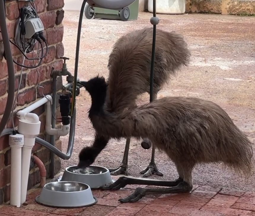 2羽の野生のエミューが家の私道を歩いてきて、開いていた門を通り抜け、敷地内へと入ってきたのだ。