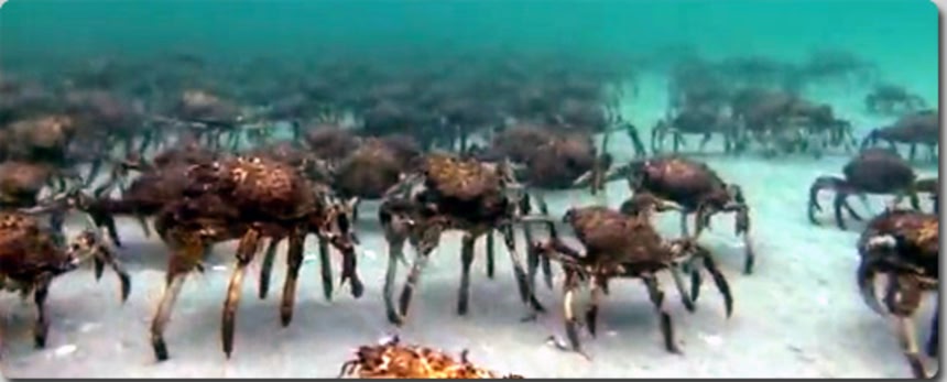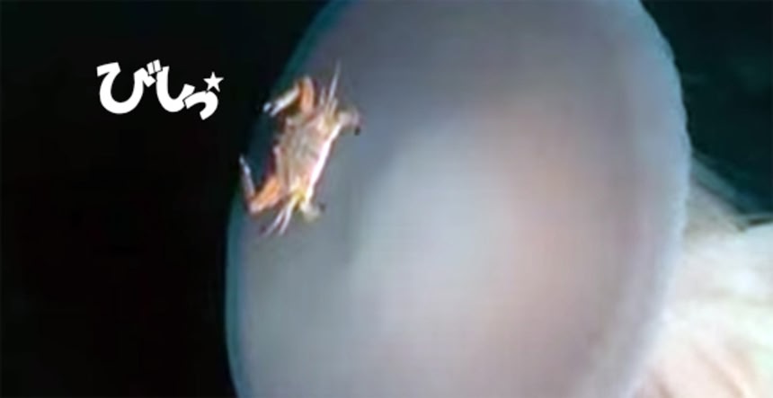 重さ180キロ以上もあるエチゼンクラゲをタクシー代わりに利用、しかも無銭乗車しているつわもののカニさんがいたみたいなんだ。横着なやつっていうのはどんな生物にでもいるもんで、いったいどんな顔してるやつなんだと思えば最後アップになるからわかりやすかったんだ。
