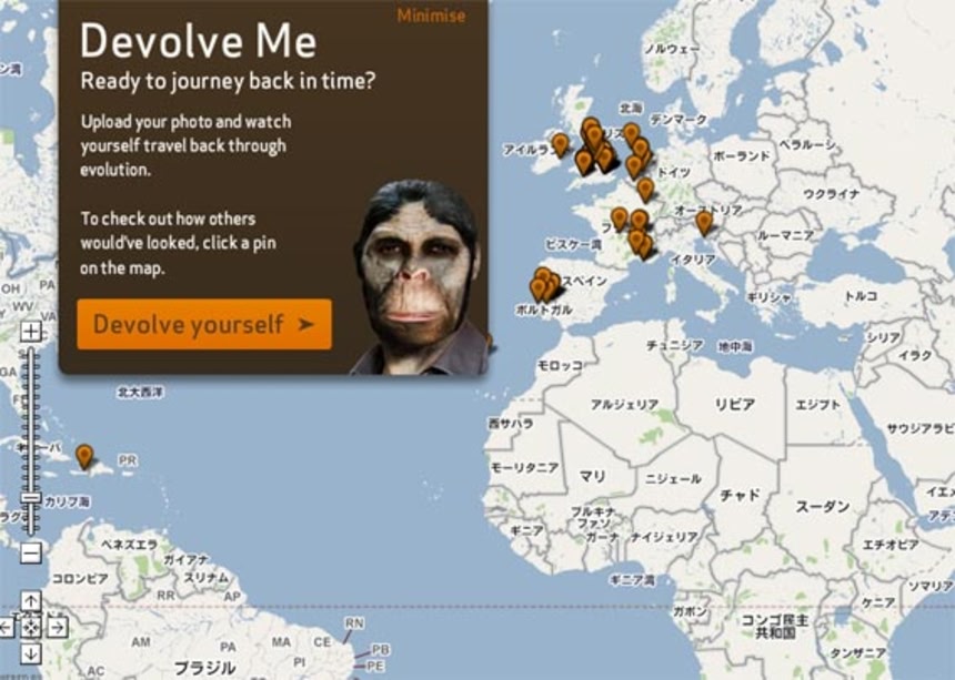 UPLOAD YOUR PHOTOをクリックしたらPC上の画像を選んでクリック。最初に四隅の枠をあわせて、目、鼻、口の位置を調節したら、Devolveのボタンで退化開始。Backボタンで前にも戻れるよ。Send to friendのボタンを押してメールアドレスを入れれば、自分にも友達にもこの退化モーフィング映像を送ることができるんだ。