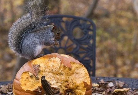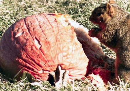 アメリカにお住いのリスさんの場合には、ハロウィンの季節ともなると、かぼちゃ食べ放題の味覚の秋となるわけなんだけれども、熟しきったかぼちゃを食べちゃったばあいには、こんな具合になっちゃうらしいんだ。