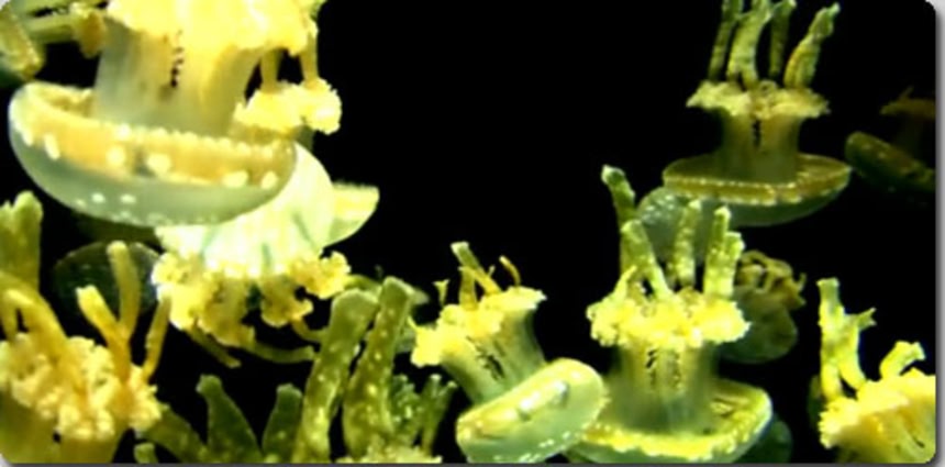 アメリカ、カリフォルニア州にある、Monterey Bay水族館の中のクラゲたち。フワフワと空中を漂っているのを見ると、心の中がセラピーされた気分になれるんだ。