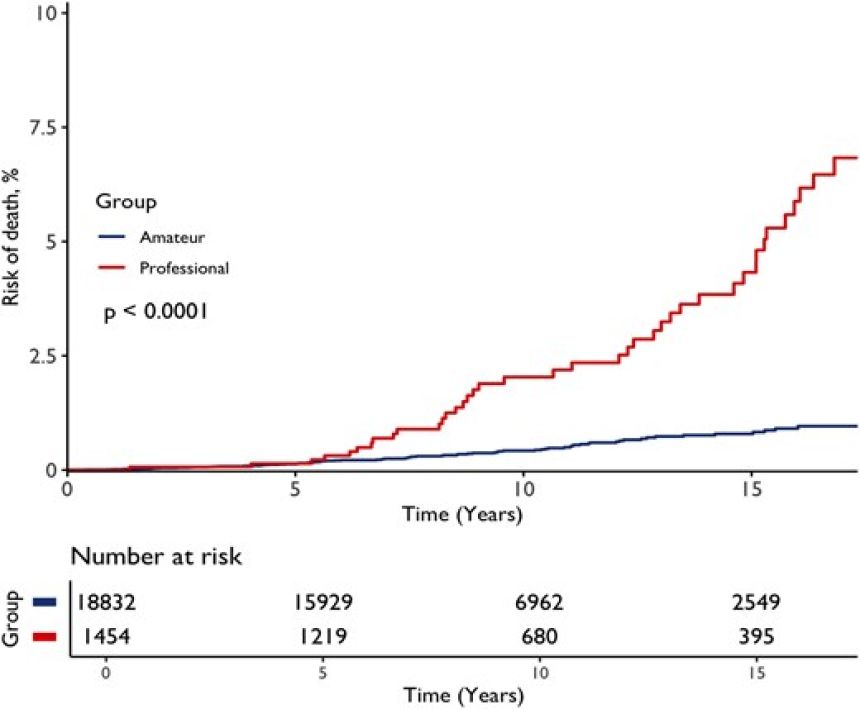 彼らの突然の心不全リスクはアマチュア選手の14倍以上で、その危険性は競技レベルが高まるにつれて急激に高まる。