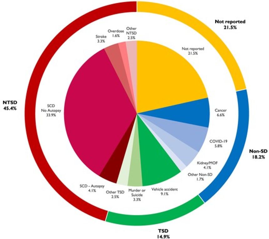 死因の一部は、ステロイドなどの能力強化薬(いわゆるドーピング)や交通事故、殺人、自殺など多岐にわたったが、圧倒的に多かったのは突然死、いわゆる「心不全」によるもので、46件がそれに該当した。