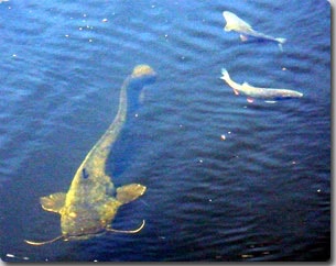 この画像を大きなサイズで見る巨大魚の全長は3~4メートルほどあることが確認されており、軍事ダイバーがこの川の調査を行っていたところ、この巨大魚に咬まれて片手を失ったという都市伝説まで流布する始末