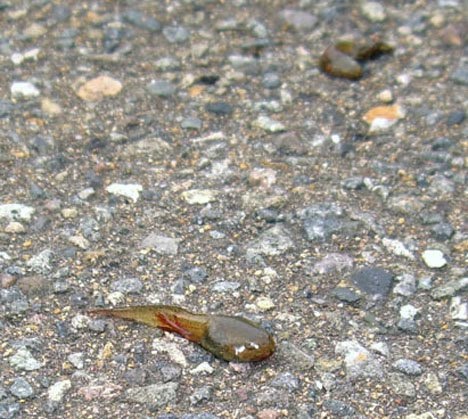 この画像を大きなサイズで見る4日は、午後4時半頃、石川県七尾市中島町の「中島市民センター」周辺の、約300平方メートルに渡り、体長2~3センチのオタマジャクシ約100匹が突然降ってきたという。