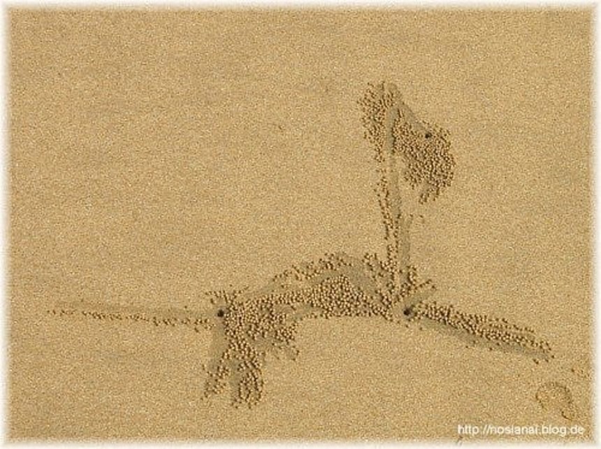 巣穴に近いところから砂団子を捨てていくのだそうで、巣穴から放射状に砂団子が広がっていくんだけれど、中にはなかなか芸術的な砂団子の配置をしたスナガニさんたちなんかもいるみたいで、それはまるで、宇宙に向けてなんかのメッセージを発信しているミステリーサークルのようで、見ていてなかなか面白いわけなんだ。