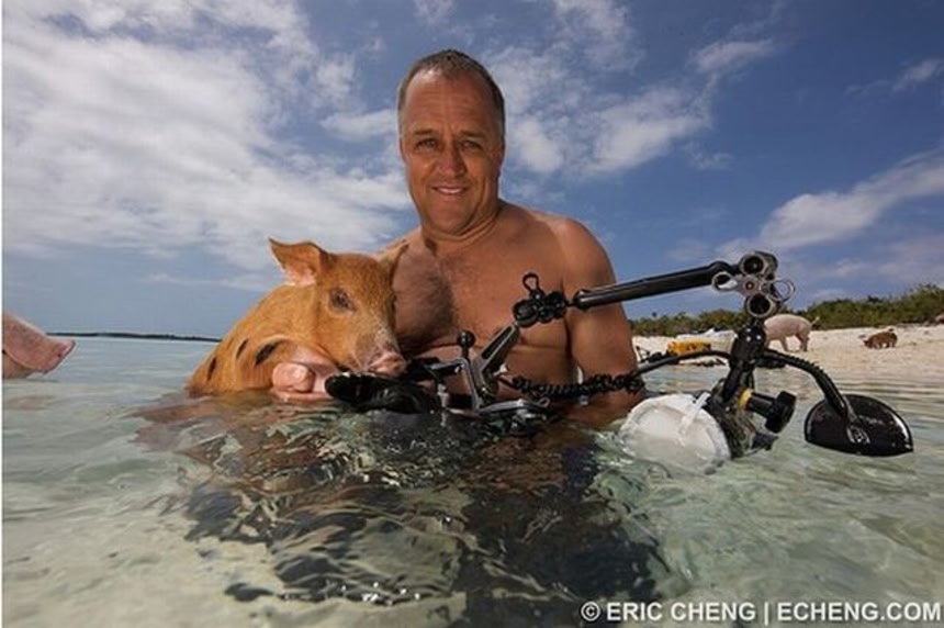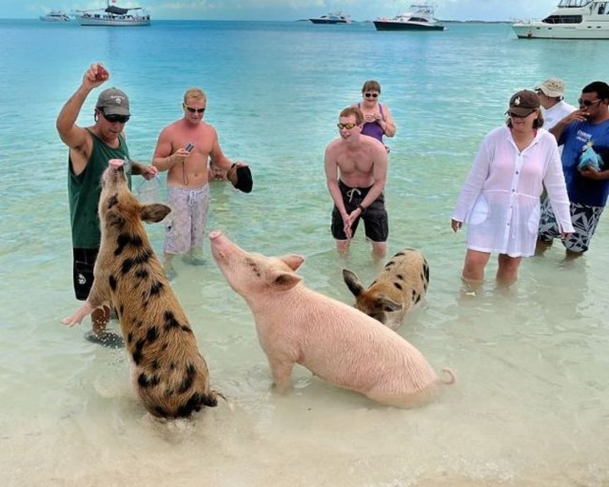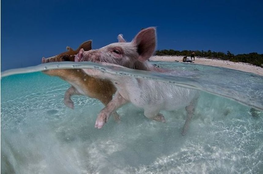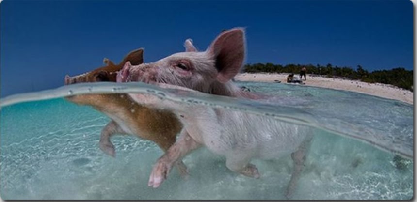 バハマの首都ナッソーから80キロメートル東南には無数の島々が存在するんだ。その中にあるエグズーマ島は、息を呑むほど美しい島。ダイバーたちの人気のスポットなのだけど、その島に住んでいる野生の豚たちは、いつからか自然と海岸に遊びに来るようになり、日光浴はしないまでも、海で泳いで人間たちと戯れるようになったみたいなんだ。