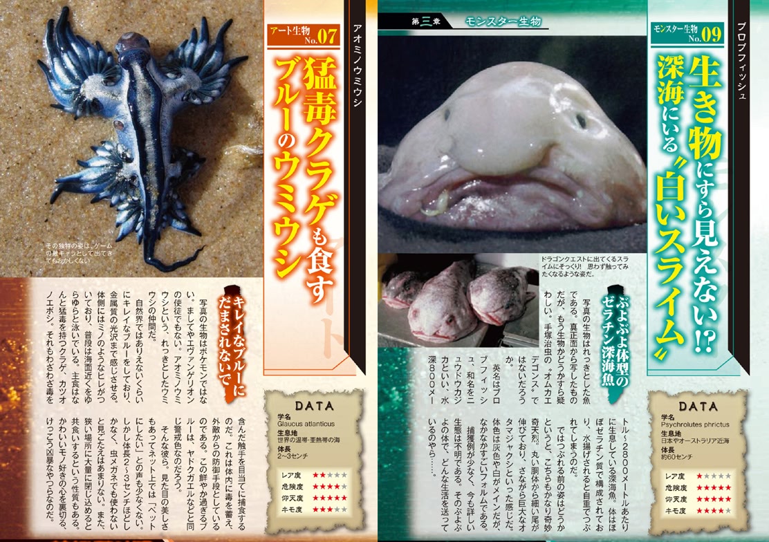世界各地の深海魚はもとより、未知生物、巨大生物、きもかわ生物なども完全網羅。その他食虫芸人佐々木孫悟空の深海魚テイスティングや、東京海底谷に潜む水中生物など、おもしろい記事がもりだくさん。DVDも付いているのでいつでも深海のモンスターたちと一緒にいることができるよ。