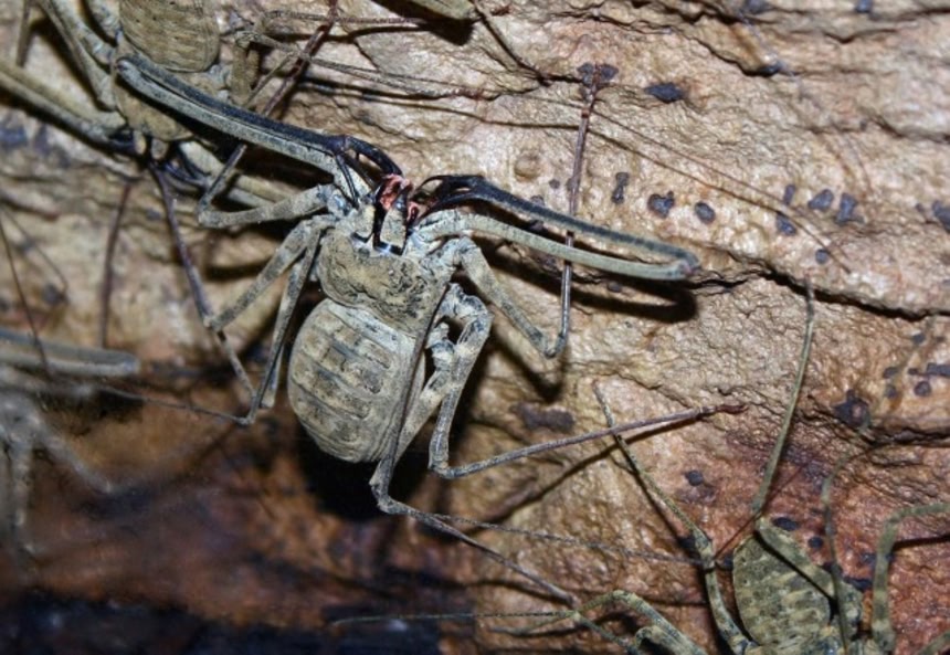 この画像を大きなサイズで見るウデムシは、主に熱帯地方の森林の朽ち木の隙間や、樹皮上、洞穴などに生息する。夜行性で、昼間は物陰に隠れる。種類によっては、洞穴の壁に張りつき、天井もはい回る。肉食性で、昆虫などを捕らえて食べるそうだ。
