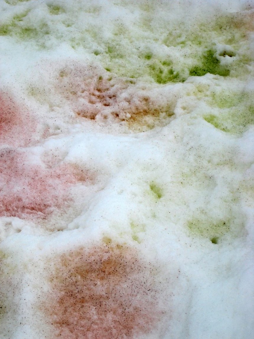 可視的なまでに広がった氷雪藻のコロニーは、藻類が持つ色素の種類により雪を赤、緑、黄色など様々な色に彩り、彩雪(現象)や雪の華などと呼ばれる現象を引き起こす。特に赤く色づくものを赤雪や紅雪、英語では微かなスイカの香りがするとして 、スイカ雪(watermelon snow)と呼ばれるそうなんだ。