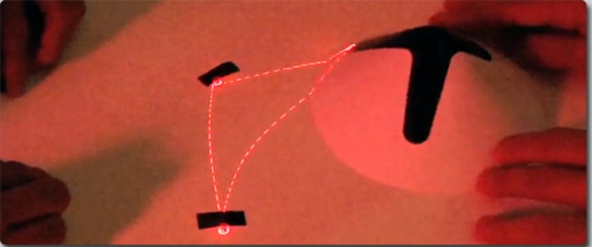 昨年開催された、デジタルコンテンツエクスポ2009で、東京大学教授のアロバロ・カシネリ氏が発表したレーザーによる人工共感覚装置「スコアライト(score light)」。