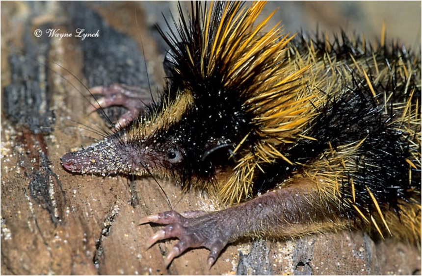 この画像を大きなサイズで見るテンレックという、マダガスカルの固有種の仲間で、ハリネズミのようなトゲトゲと、マルハナバチのような黄色と黒のシマ模様を持ち合わせた動物、それがこの「シマテンレック(Lowland Streaked Tenrec)なんだ。
