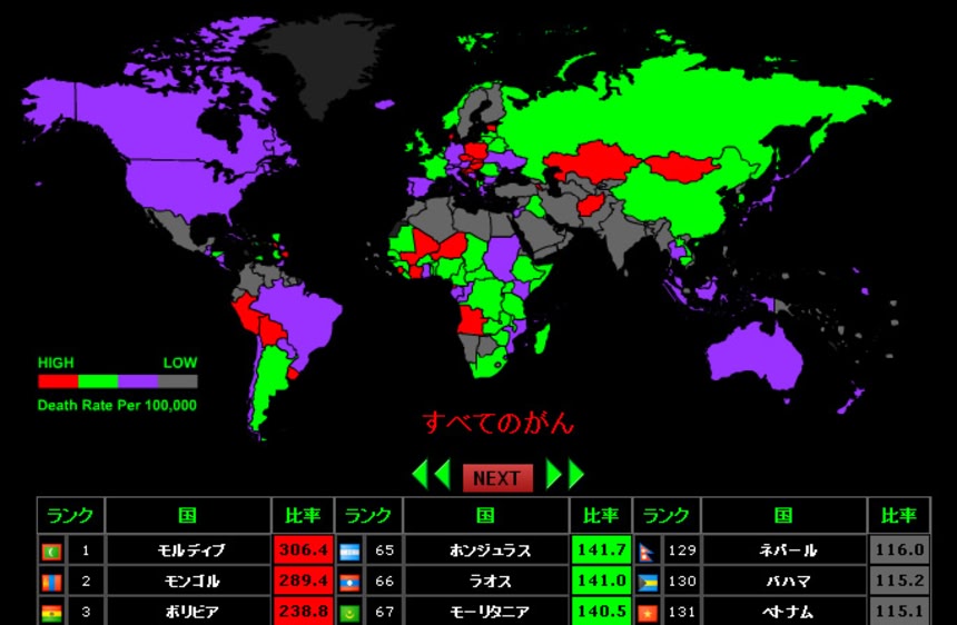 死因別にMAPとランキングで表示されたまさしくこれが死のデスノート。その他国別に死亡数の多い死因などもランキング表示されているんだ。