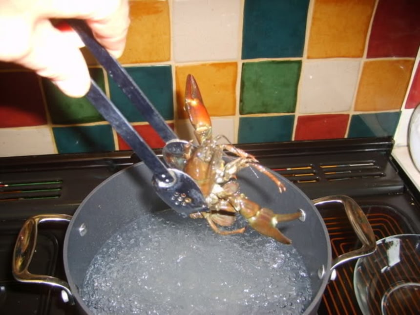 ウチダザリガニの捕獲から茹で上がりまでの画像