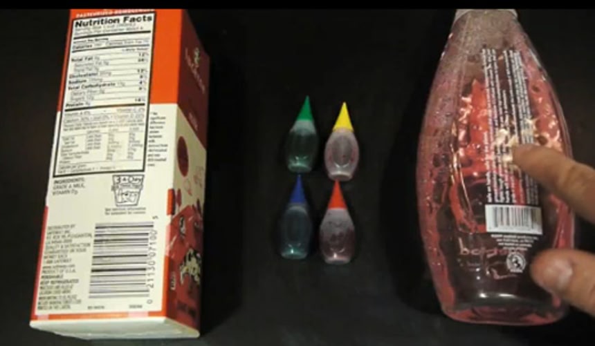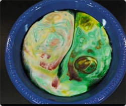 映像のように順番にそれらの液体を牛乳にいれておくだけで、踊る色によりつくられたさまざまなアート作品を見ることができるんだ。