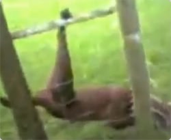 犬が柵に引っかかっている