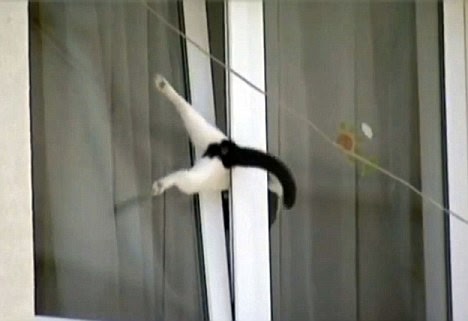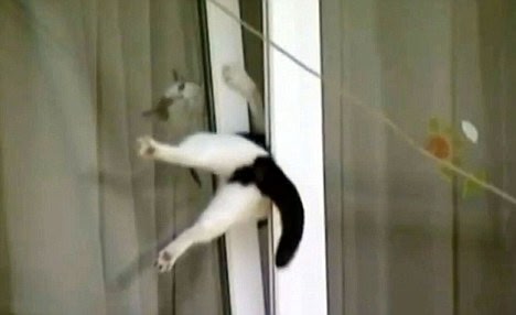 ルーマニアのとある町、交通量の激しい道路に面した建物の2階に体半分が挟まれ宙ぶらりんの状態でもがいている猫。