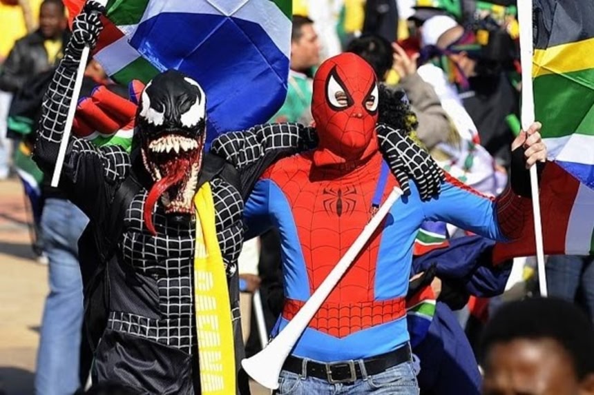 2010 FIFAワールドカップは、会場が治安が結構やばかったらしい南アフリカということで、どうなっちゃうのかしらと様子を伺っていたのだけれど、各国のサポーターたちはそんなことはアイドンノウなおかまいなしで、誰に狙われても文句の言えない見事なコスプレっぷりを見せてくれたんだ。欽ちゃんの仮装大会が毎年行われている日本の場合にも、その生き様、貫いてくれていたみたいだし。