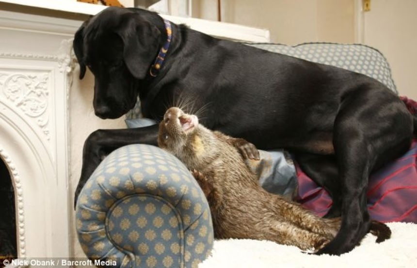 カワウソはとっても社交的な生き物のはず。そこでスタッフは、カワウソに友だちを与えたんだそうだ。生後8ヶ月の黒毛のラブラドールレドリバー、モリーさん(メス)と引き合わせたところ、二匹はダイの仲良しに。
