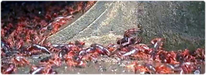 岡山市東区神崎町の住宅地の用水路に、大量のアメリカザリガニが出現。約500メートルの範囲内で、ザリガニたちは折り重なるように密集したり、威嚇行動をとったり、どよどよと蠢いており、その異様な光景に住民たちは恐怖すら感じているという。
