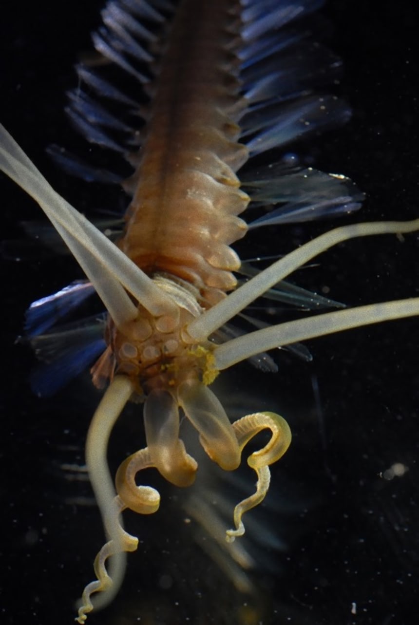 イカ虫(Squid worm)の名づけられたこの生物、体長は3センチほど。頭には、自分の体より長い触手が10本ついていて、胴体には薄っぺらい羽毛のようなものが無数についており、これをとても優雅に動かしながら水中遊泳しているんだ。