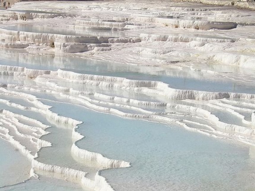数年前に行きましたけど,ホテルによる温泉水のくみ上げ過ぎとかで,相当水量は減っていました.ほとんど干上がっていて,ところどころ水が溜まっている程度.ここの写真みたいなものを想像していたのですが,かなりがっかりしました.この石灰でできたプール部分の温泉に入るのは禁止されています.