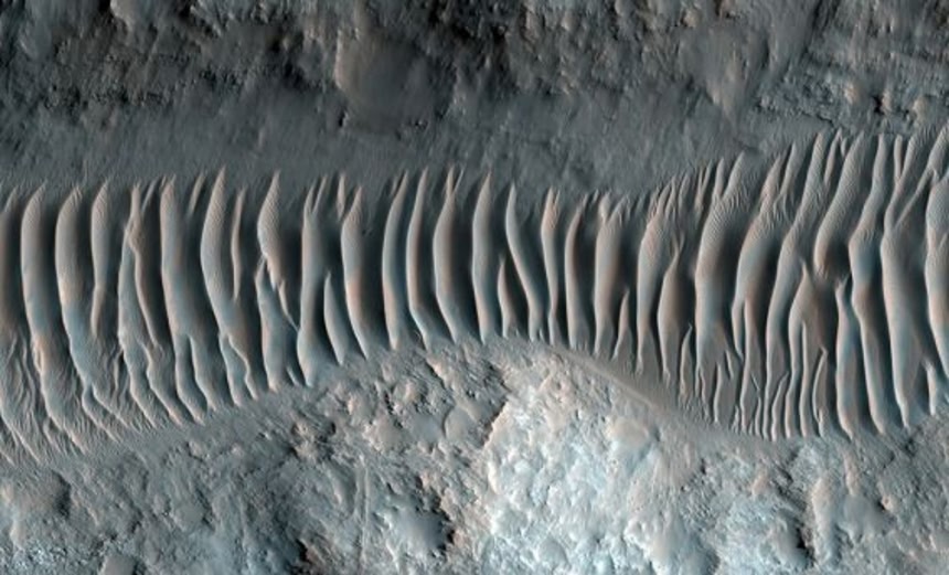この画像を大きなサイズで見る火星の南半球にあるスカラップの砂丘