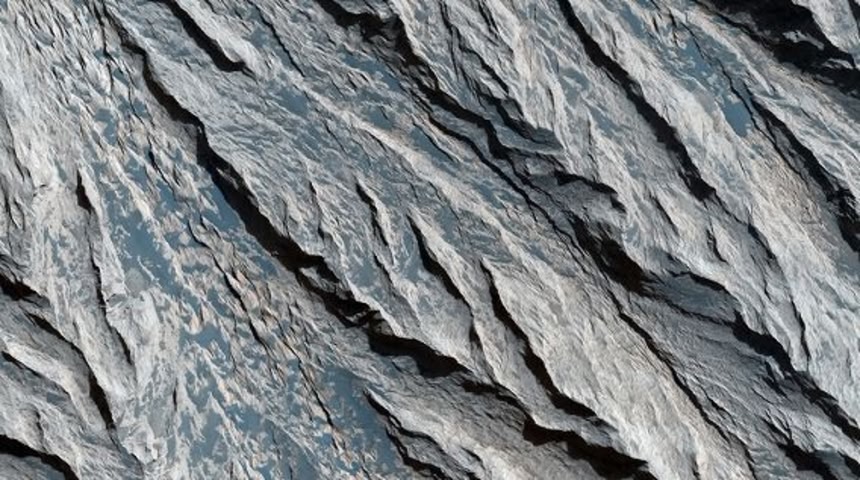 この画像を大きなサイズで見る火星の南極、氷の中に二酸化炭素が入り鋸歯状になった地表