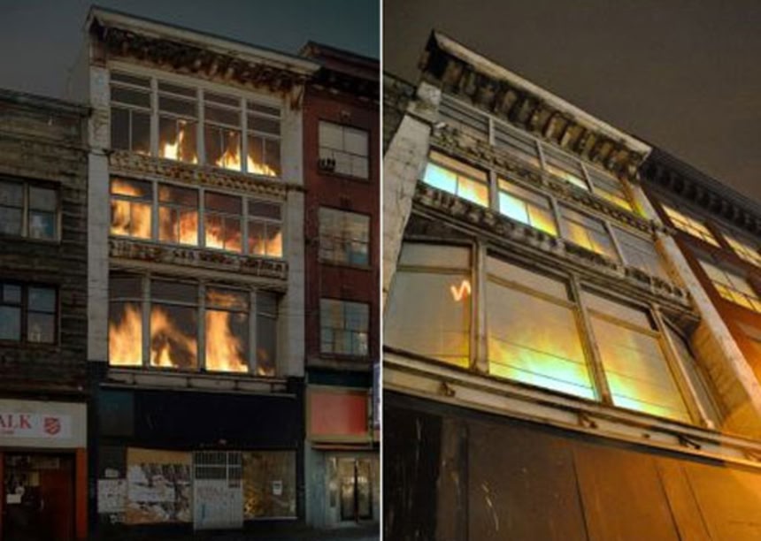 これは、バンクーバーのアーティスト、イザベル・ハイルの作品で、バンクーバー東地区で最も古い街の4階建ての建物に、プロジェクターを使って「火災」を投影。知らない人が見たら、燃えてる!!とびっくり仰天すること請け合い。