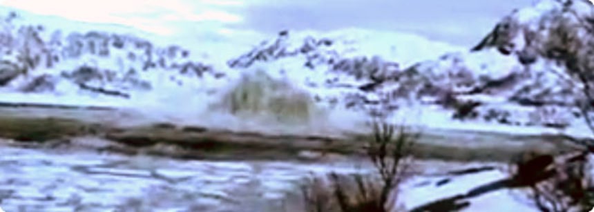 水力発電所に水を送るために、直径810メートルの池の上に張った厚い氷を150キロもの爆弾で爆破させる映像。まずはヘリで爆薬を氷の張った池に運び込み作業がはじまるんだ。実際にはものすごい爆音がとどろいただろうね。